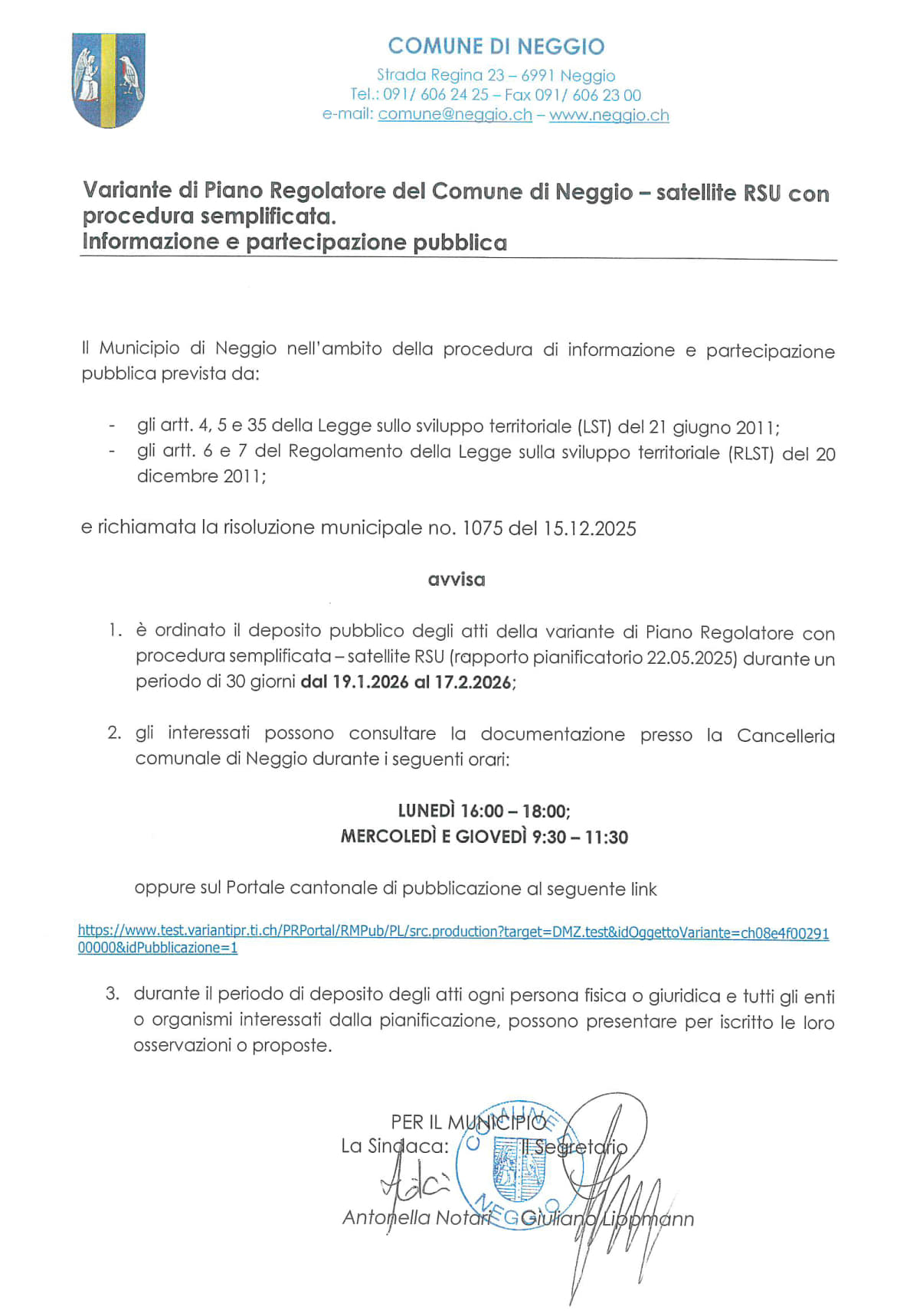 Avviso di pubblicazione variante PR satellite RSU con procedura semplificata